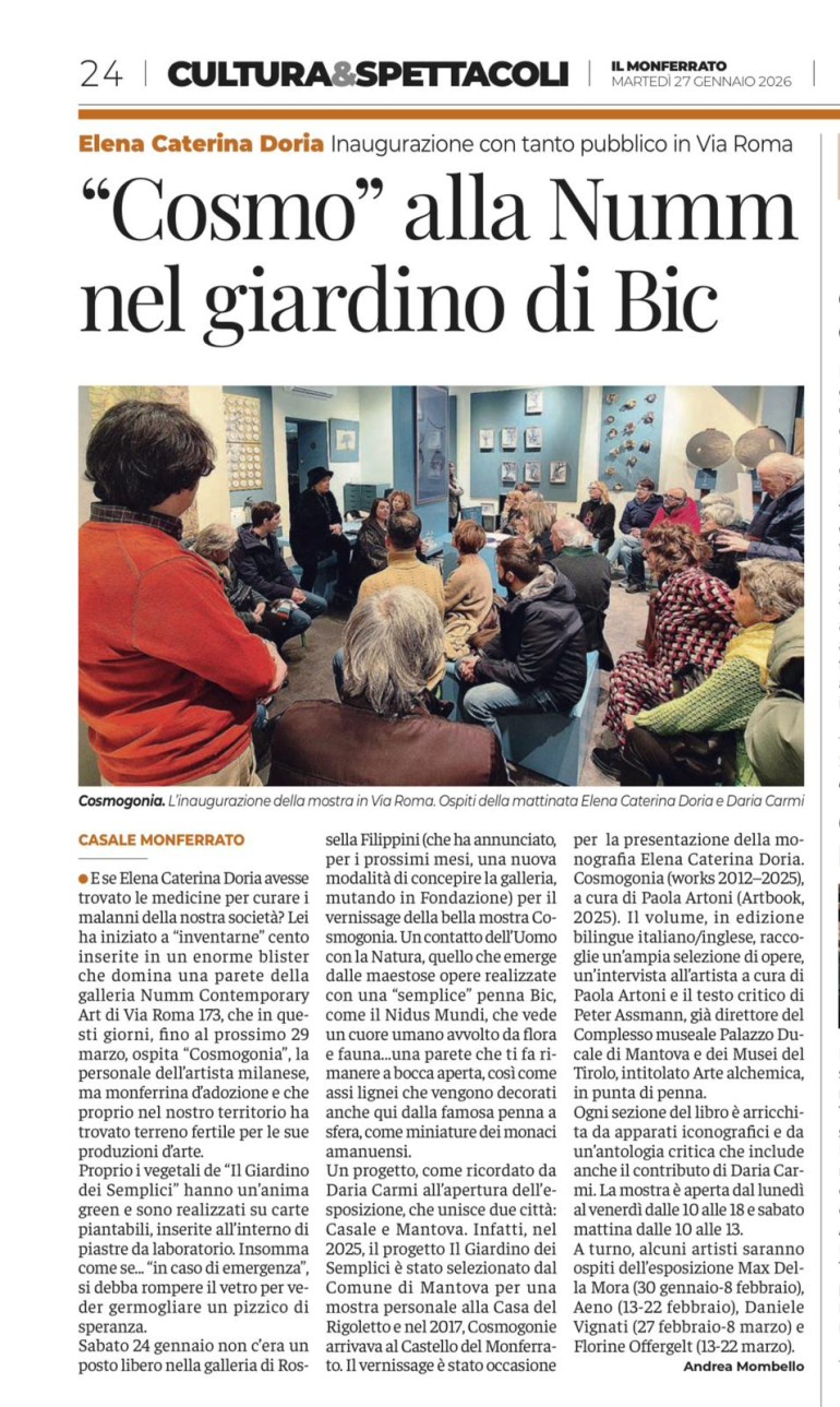 dal 27 Febbraio all'8 Marzo le sue opere in entreranno in relazione con l’universo visionario di Elena Caterina Doria, dando vita a un confronto fatto di affinità, contrasti e nuove risonanze.
